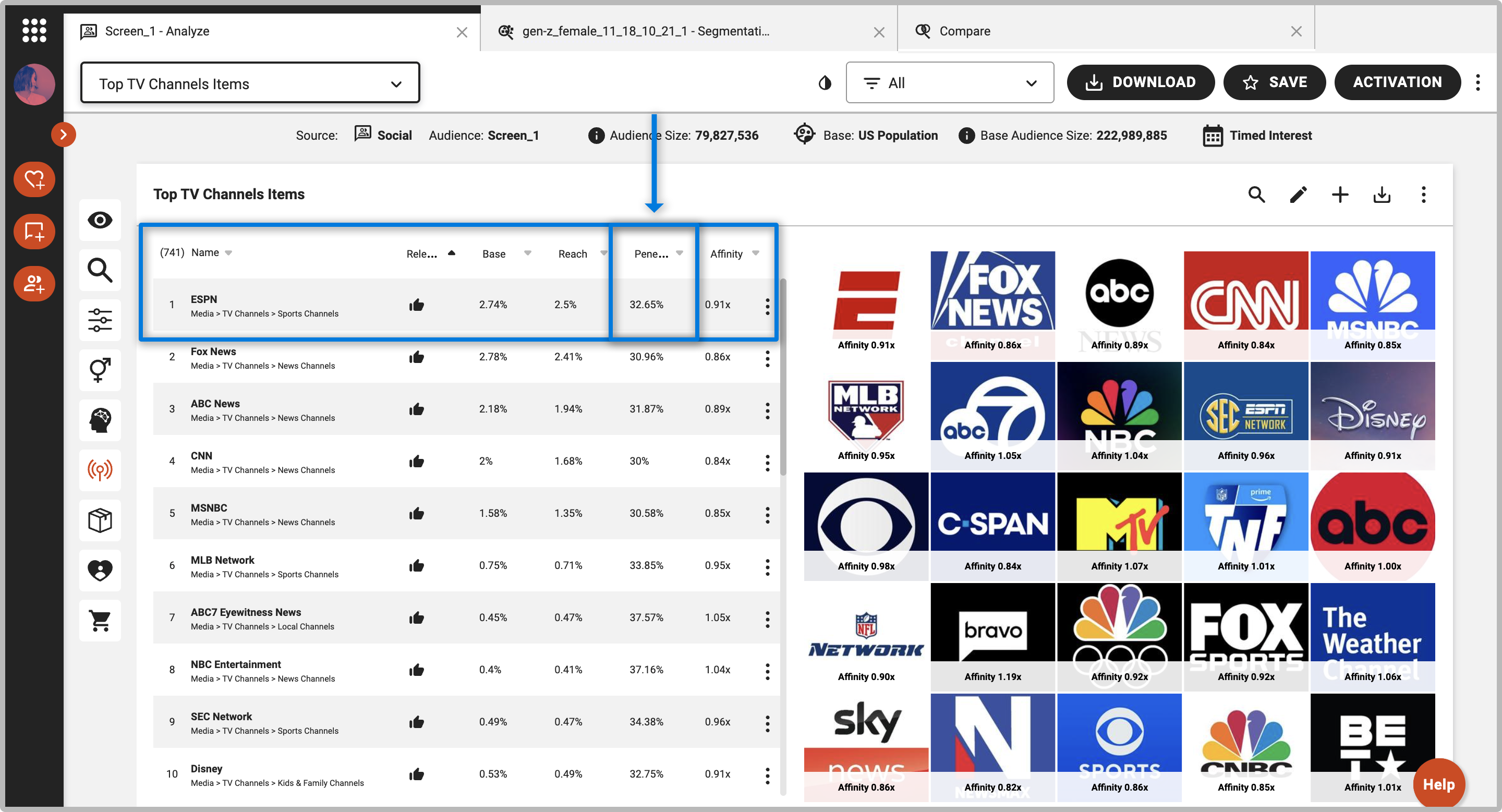Penetration can be used to understand opportunity, particularly when looking at media and influencers. Penetration can tell you what percentage of that media or influencer’s audience is in your queried audience.