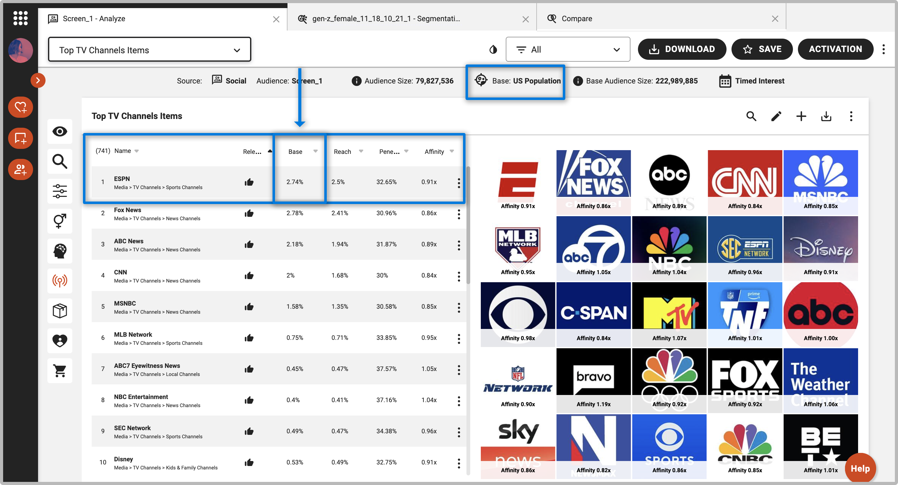 Base percentage can serve as a helpful benchmark to quickly see how many people have a certain interest, lifestyle, or demographic trait on average.