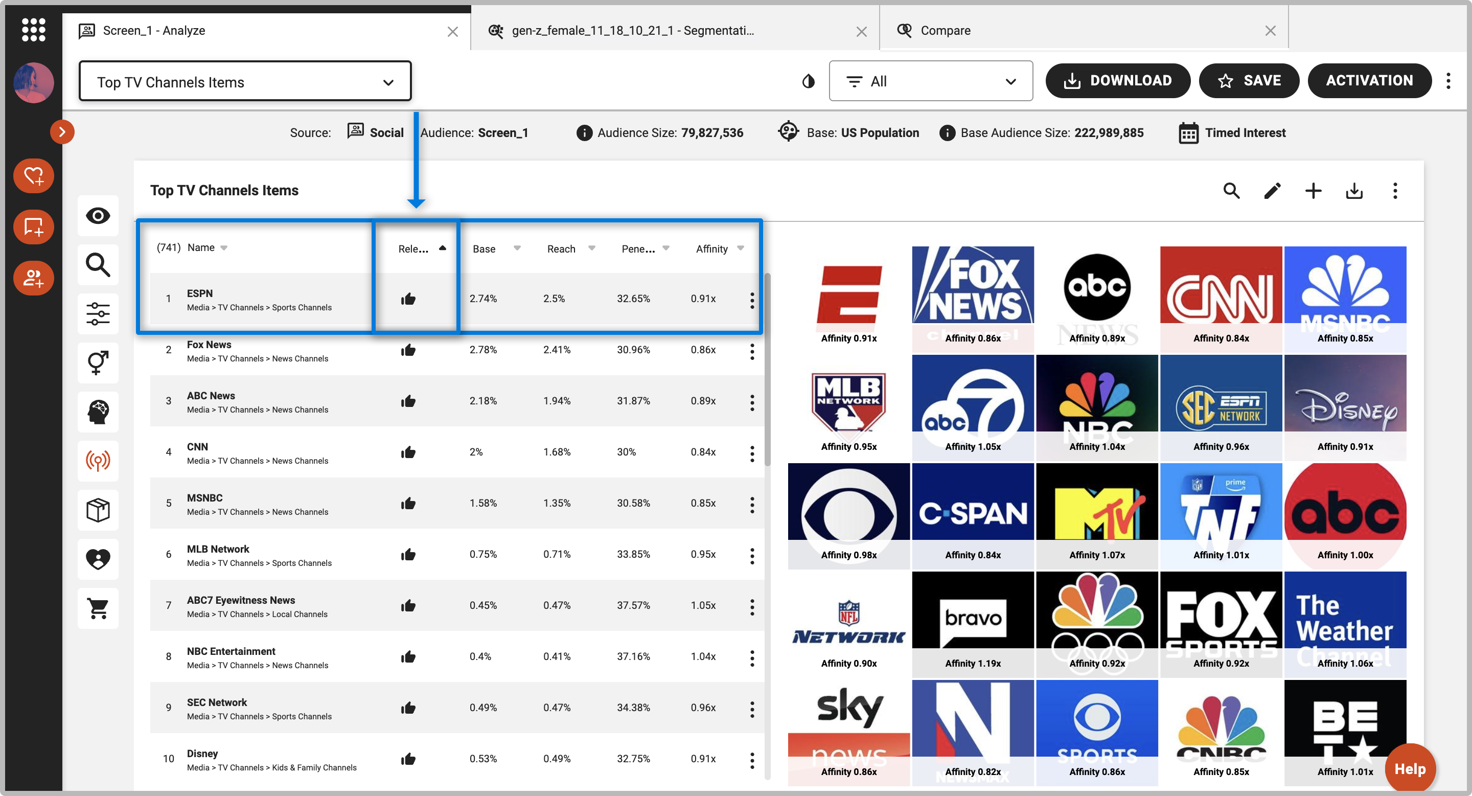 Relevancy can help identify topics that may resonate most with your audience, and can be a great way to sort results as it takes both reach and affinity into account. It is also a helpful secondary indicator when you are viewing a table sorted by another metric such as reach, affinity, or penetration.