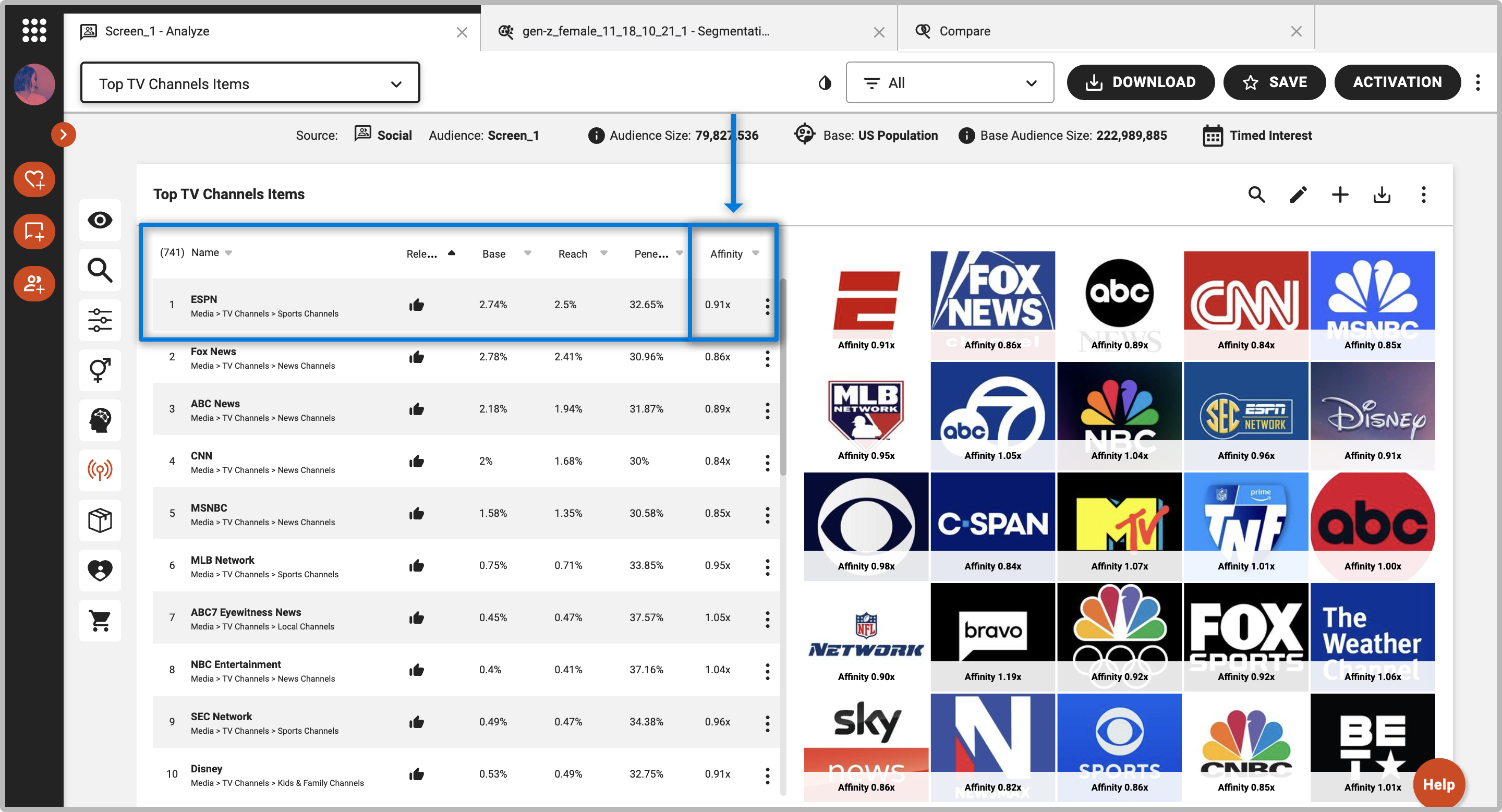 The Affinity Index in the Discover platform calculates how the audience you are analyzing is different from your base population. Affinity is the leading indicator of what is distinctive and unique for your audience.
