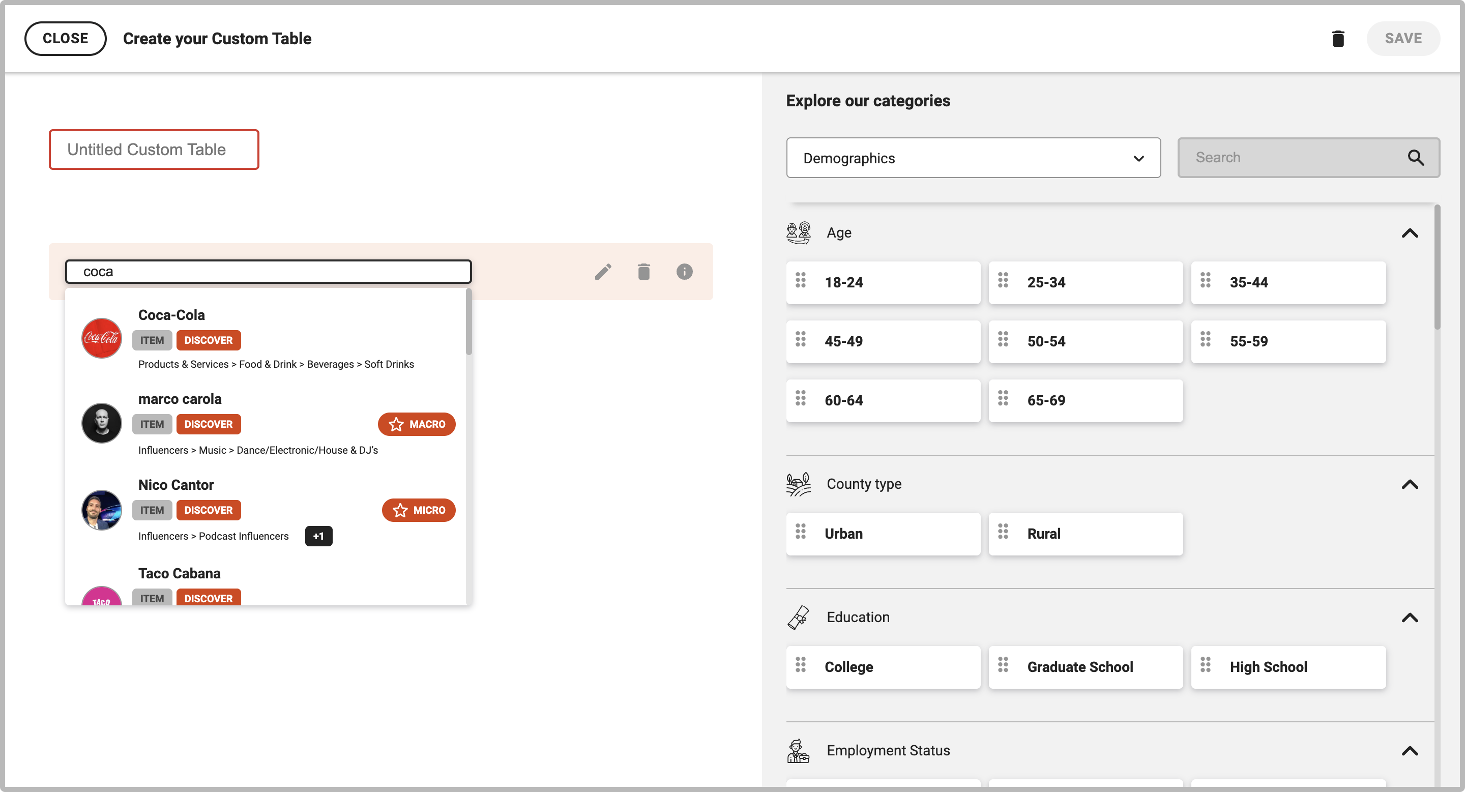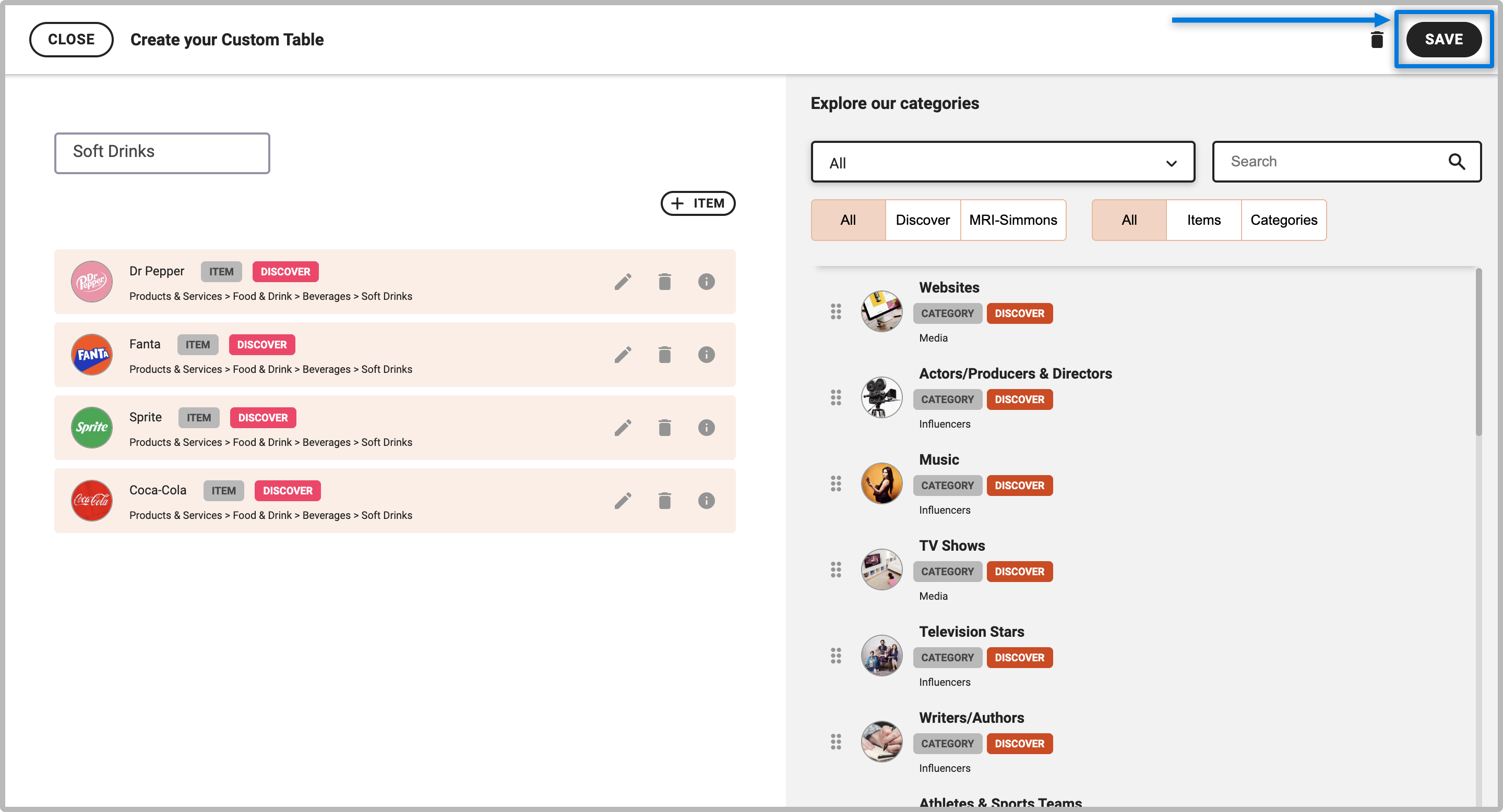 3. The first step is selecting the data for your custom table. Use the "Search" option to add the specific brand, influencer, psychographic trait, product/service category or influencer category that you want to include in your custom table. The Discover platform will automatically pull the list of items that match your search term. You can also search using the drop down menu, which guides you through Discover's interest and influencer taxonomy. For Discover clients who subscribe to the MRI or Simmons Research Data Fusion, you’ll also see additional consumption data options from MRI or Simmons.