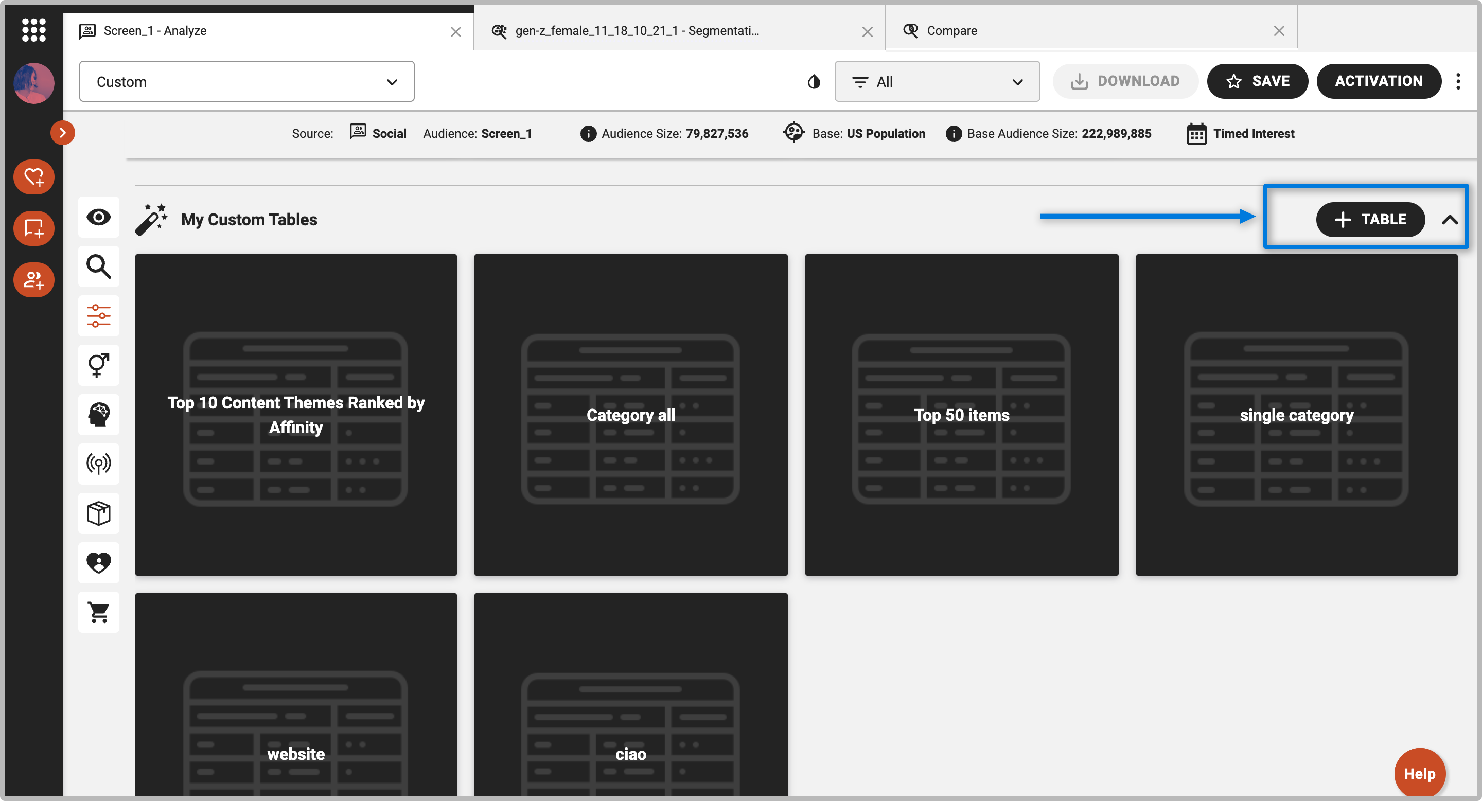 - To add your custom table to a new or existing custom template, click the "+" icon located on the top right corner of the table