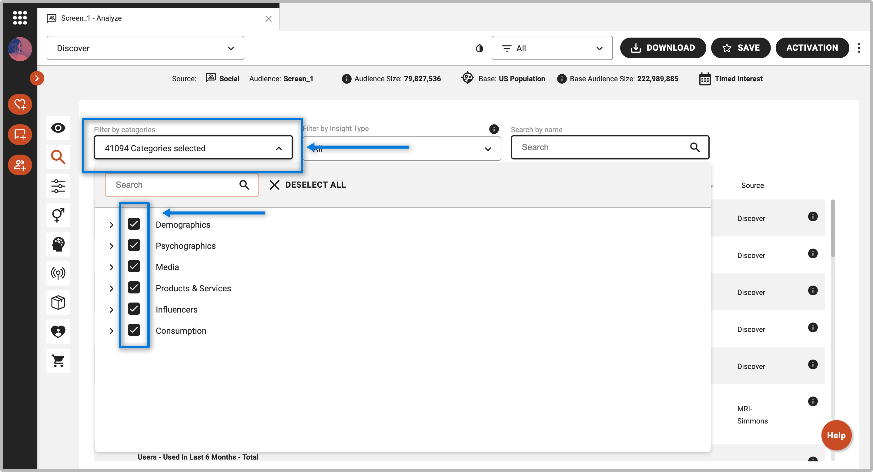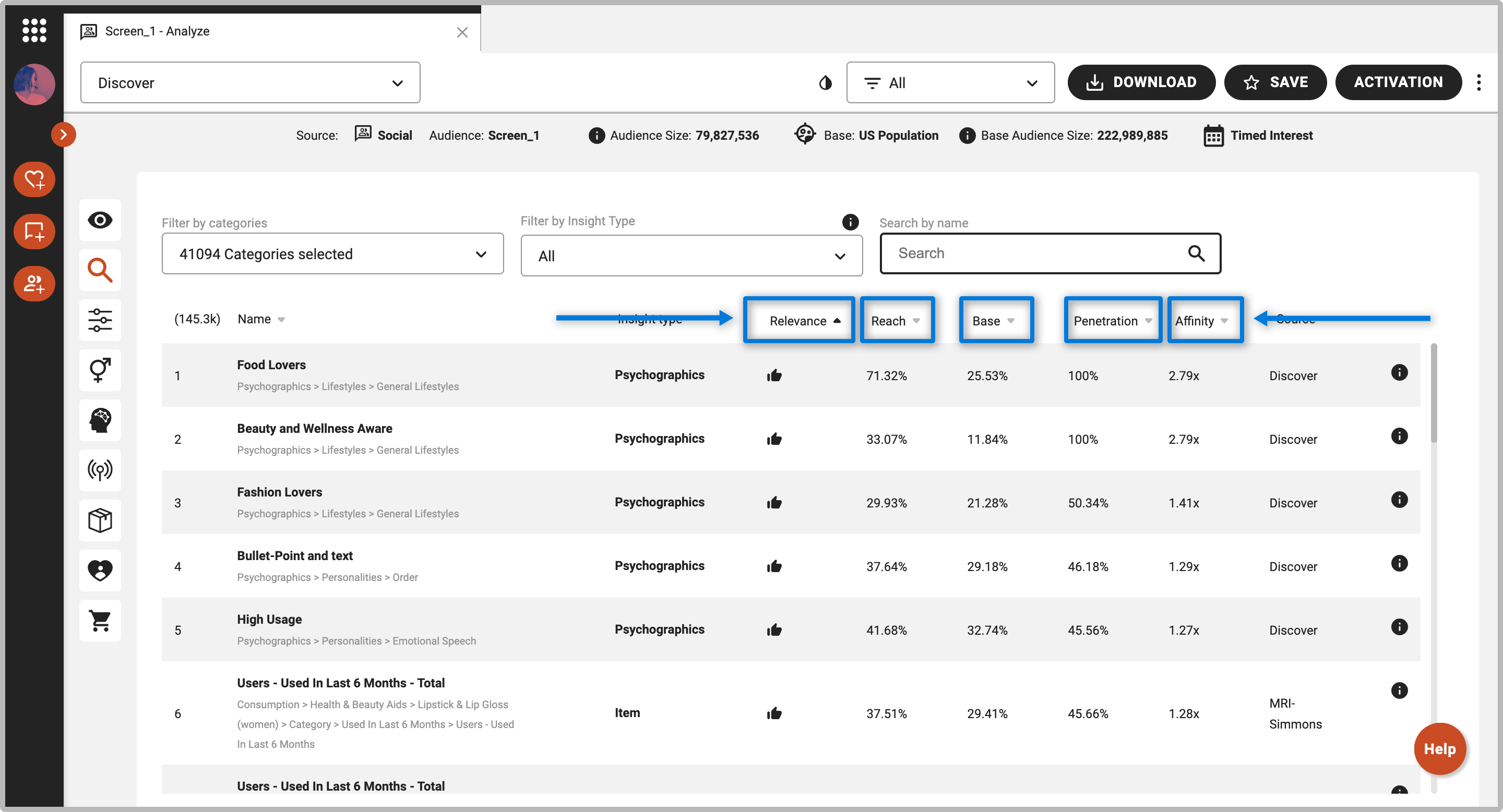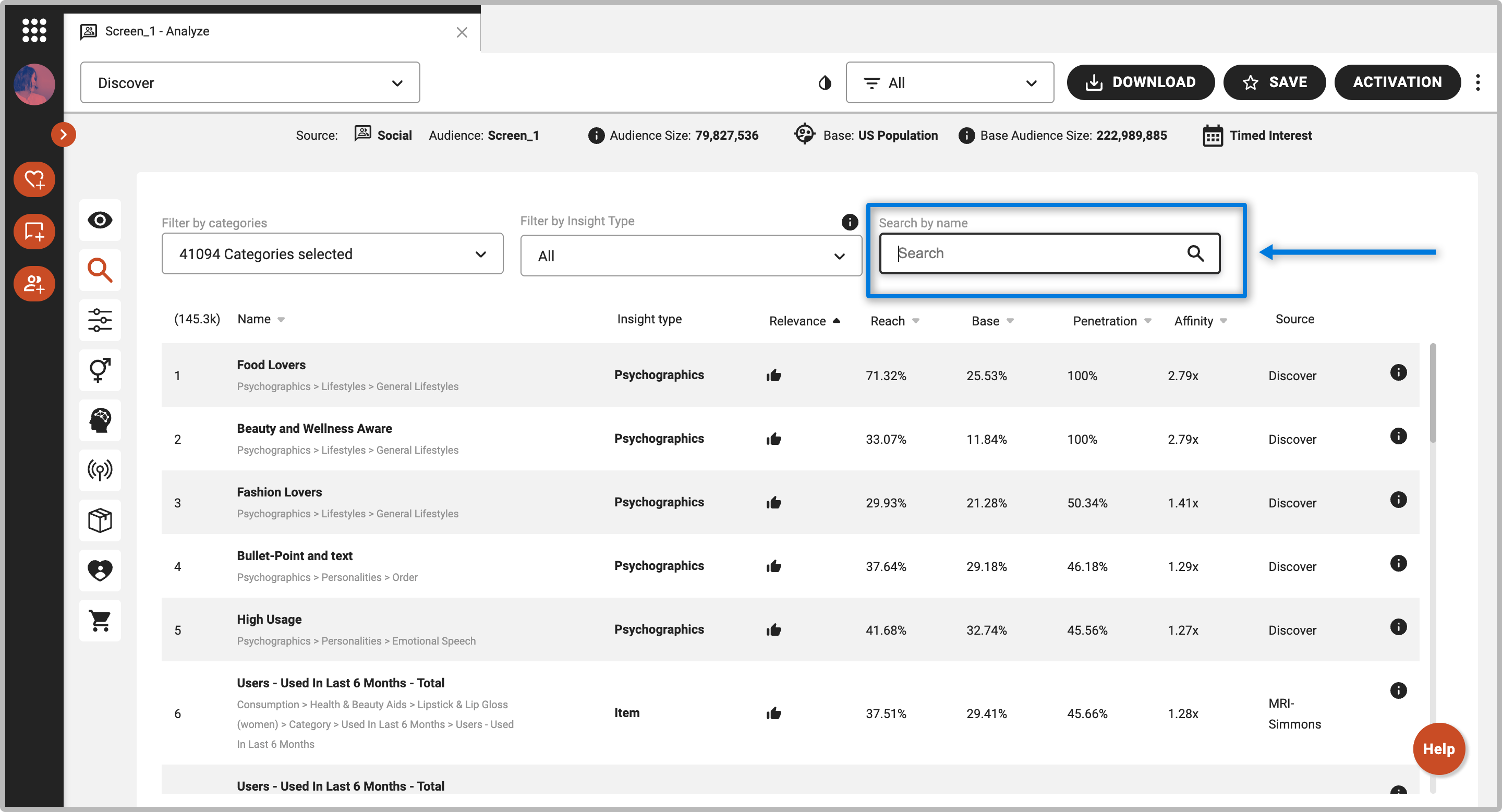 on the left-side panel, or use the dropdown menu and select “Discover.” By default, all products and services, media, influencers, psychographics, and demographics from the platform will be shown and will be sorted by Affinity.
