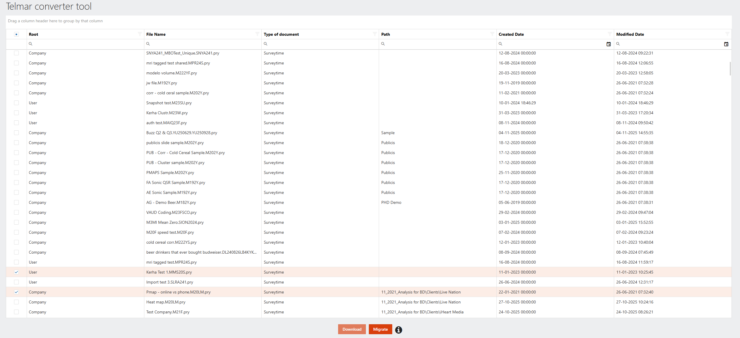 5. Click on the “Migrate” button to view the pending files. Verify all needed PRY and PRX files are here