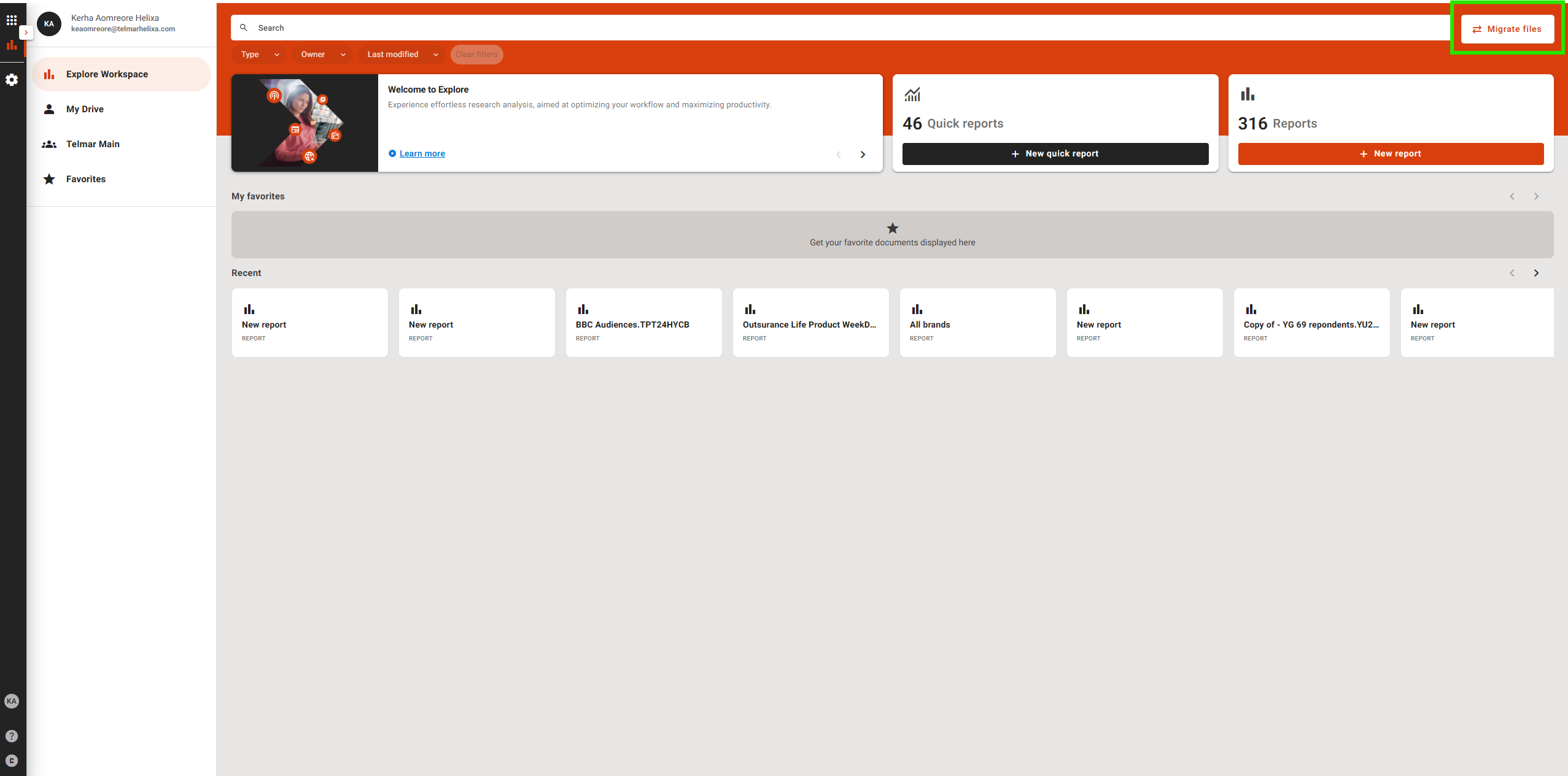 4. Login to Explore. Once logged in, a “Migrate” button will be visible on the right of the search bar in your Workspace