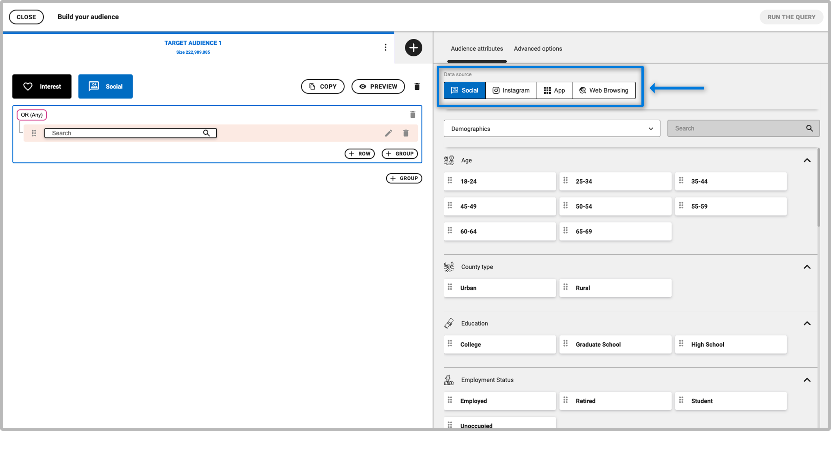 - You can use the right-hand panel to explore categories that are available, and to click or drag and drop demographics into your query. Use the dropdown menu above to filter the available data types and categories.