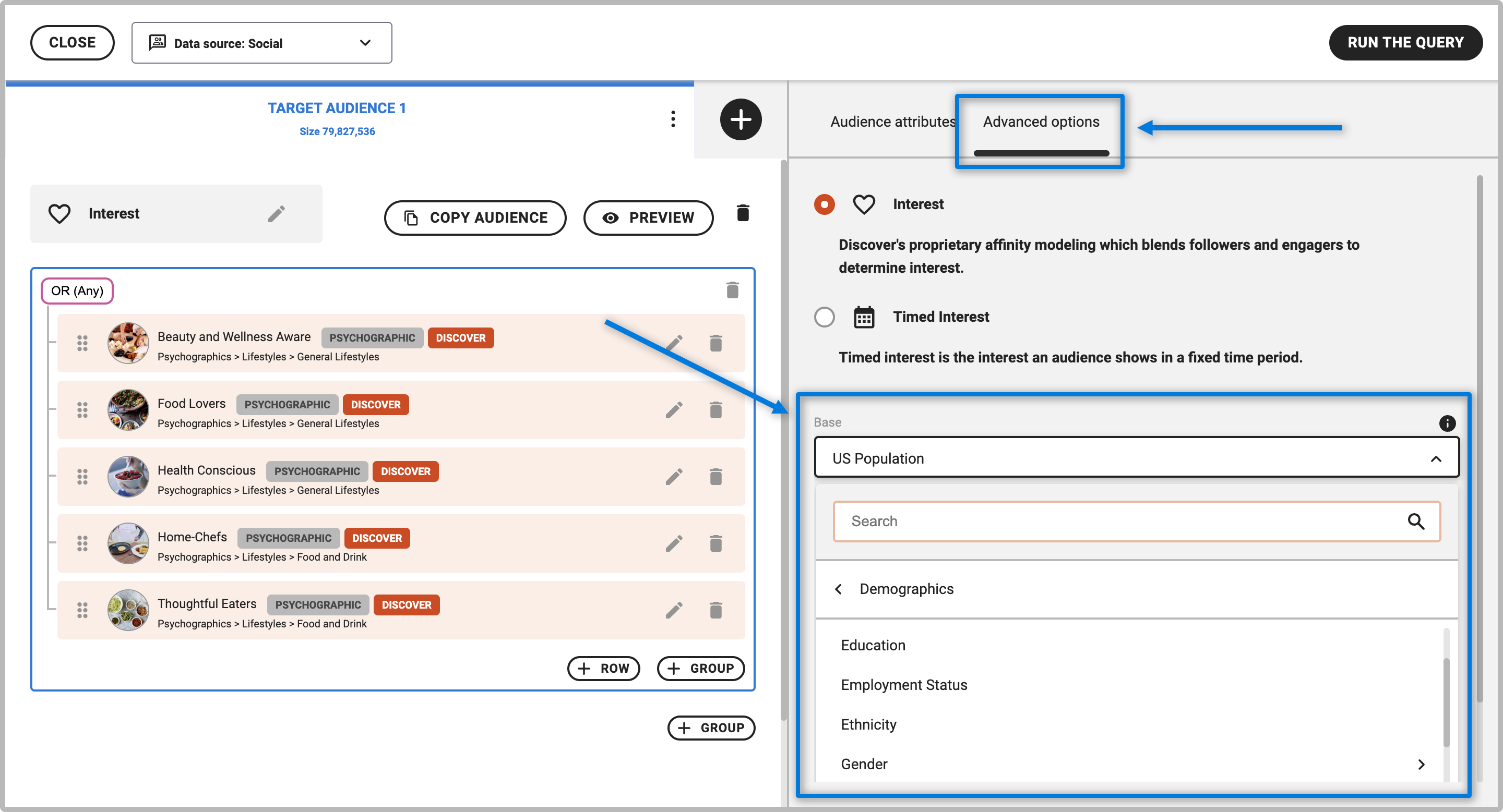 Note: Changing the base will change the overall audience you are pulling from. For example, if you select your base as female, you will only see females in the results even if you do not add female to your query.