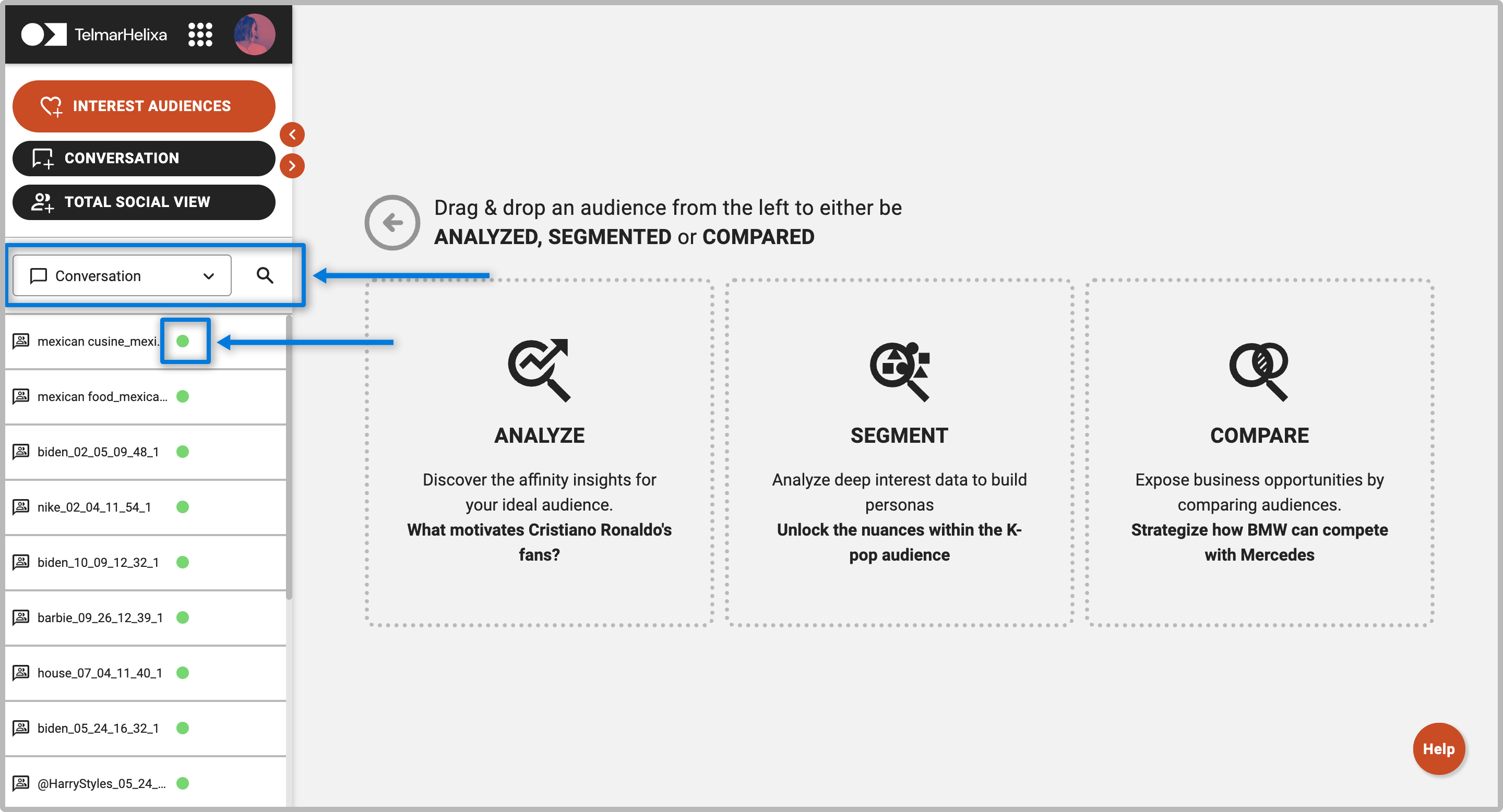 - Once your audience has finished matching, you can drag and drop it into the “Analyze” section from the left-hand side of the screen to view results. You will know the audience is finished matching by the green dot next to your query.