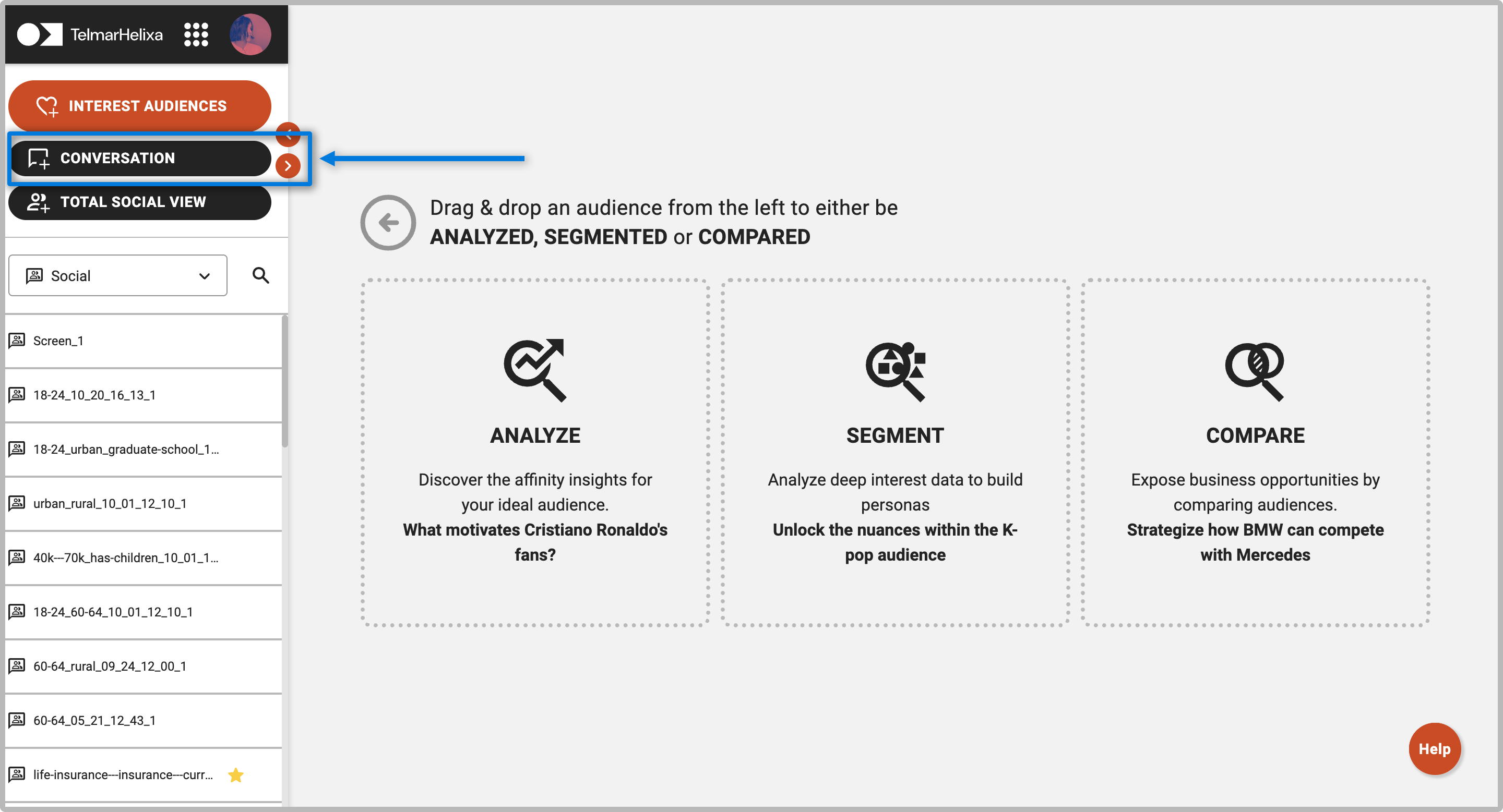 - Log into Discover and click the blue “+ Conversation” button in the top left corner of your screen.