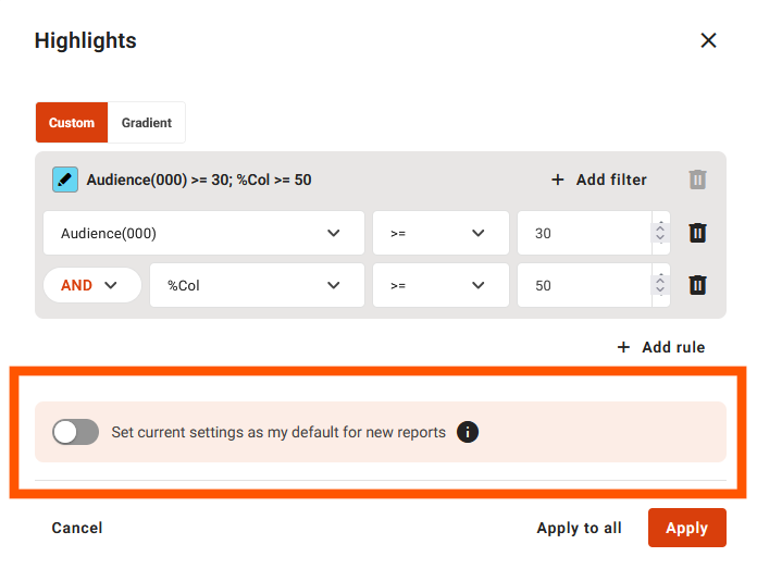 - The ability to Apply heatmaps or highlights to all report views is now possible by using the Apply to all button on the pop-ups.