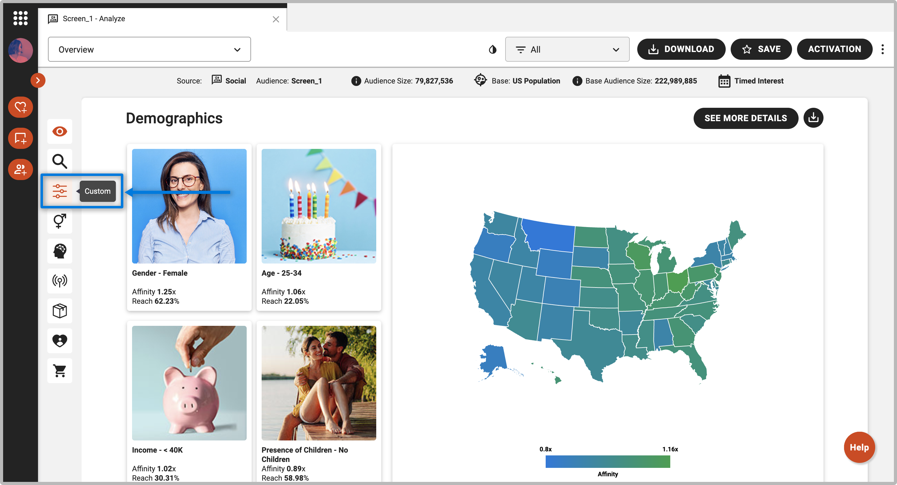 - Within the Demographic, Lifestyle, Media, Products & Services, or Influencers sections, select the plus sign