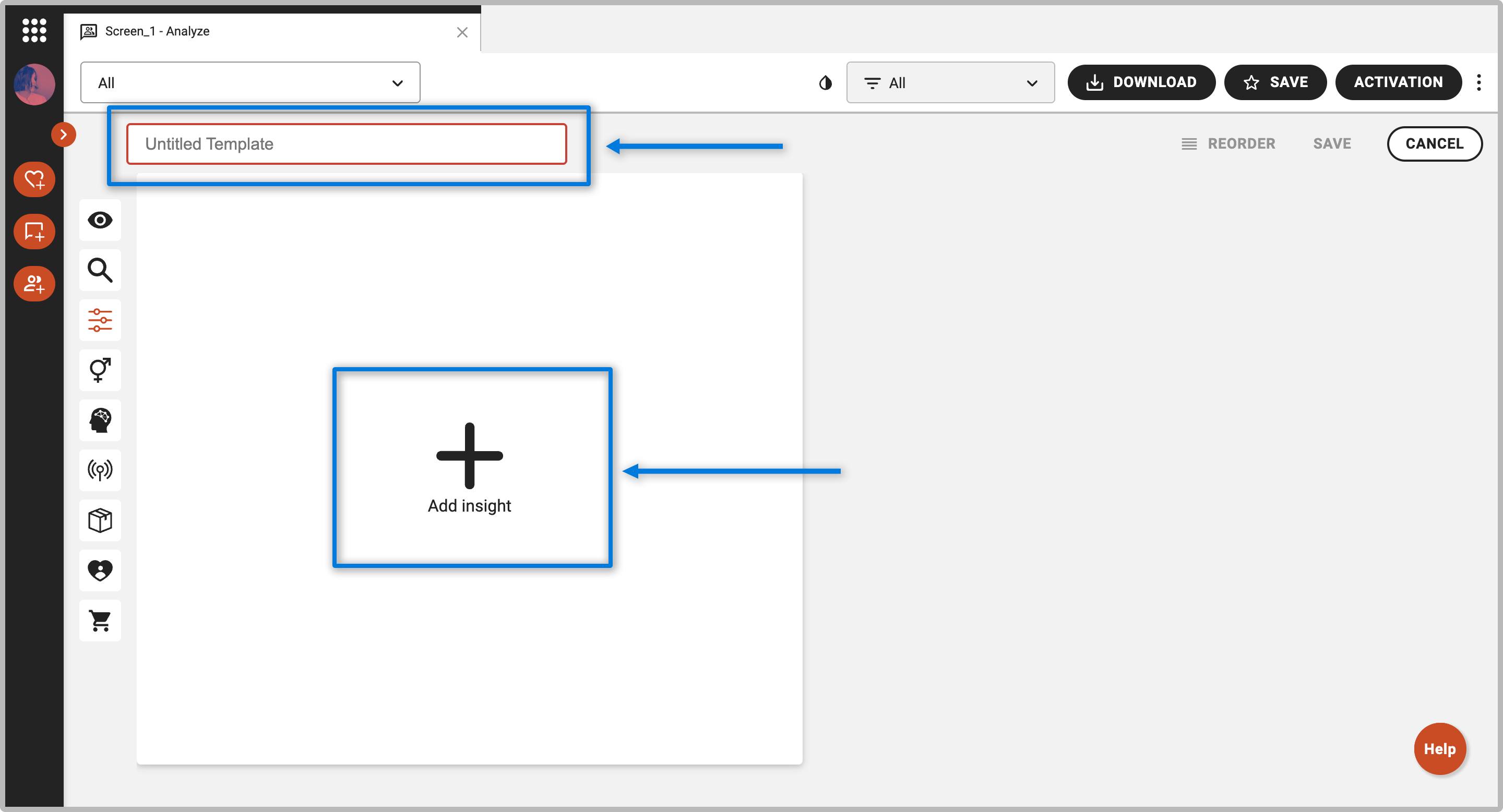 - To start adding tiles, click the big plus sign above “add insight.”