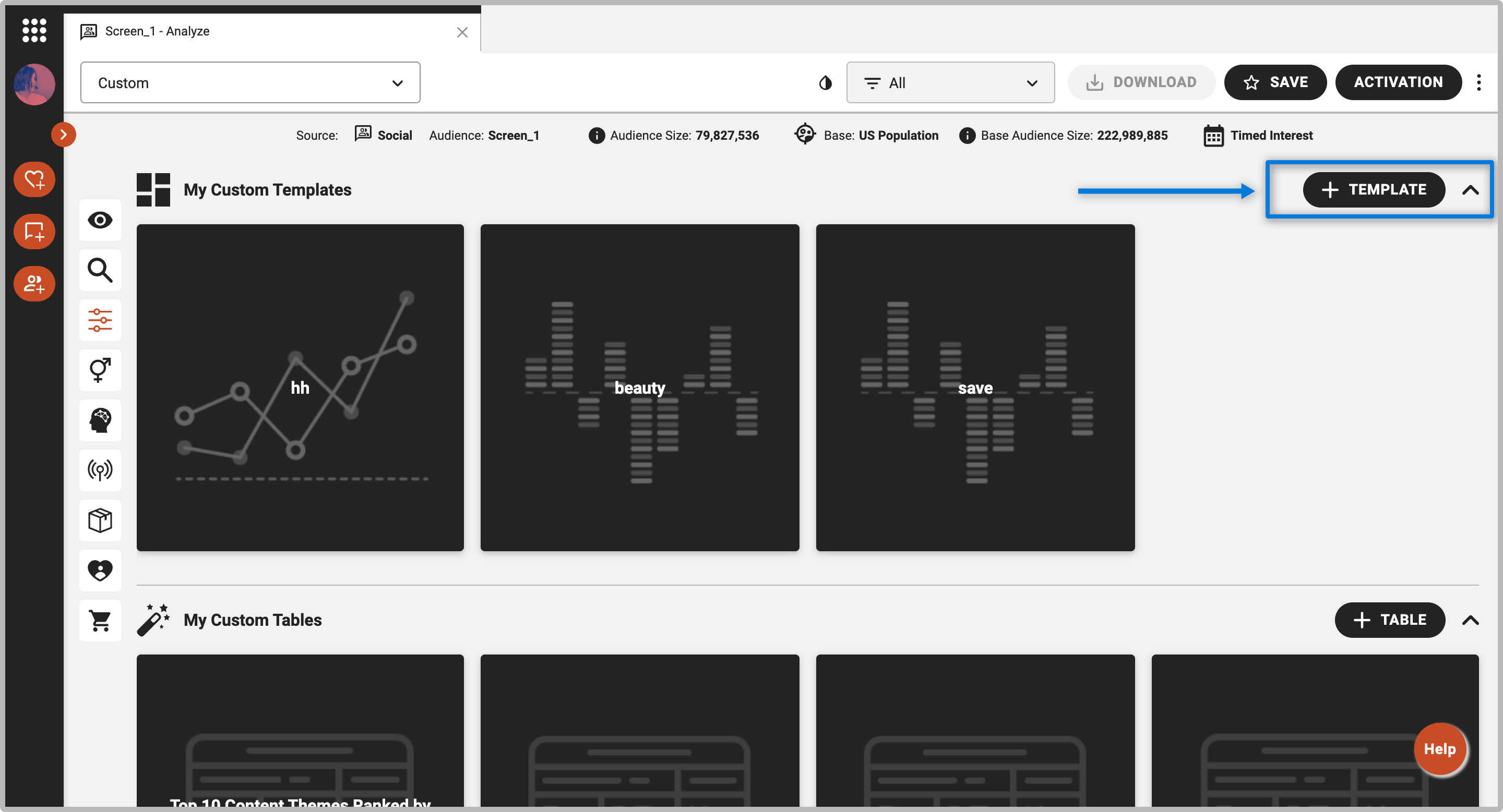 - On the top right area of the screen, select + TEMPLATE. This will create a blank Custom Template.
