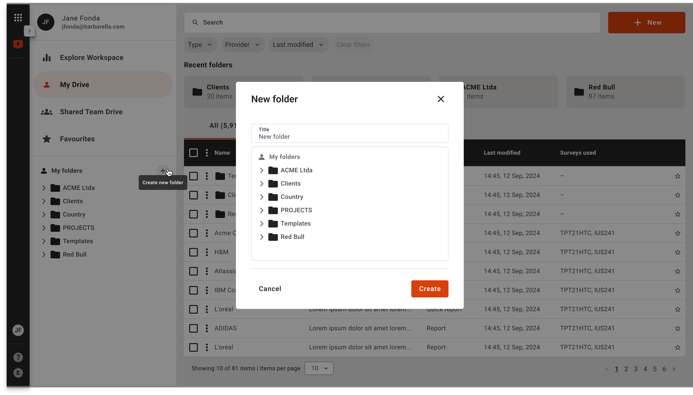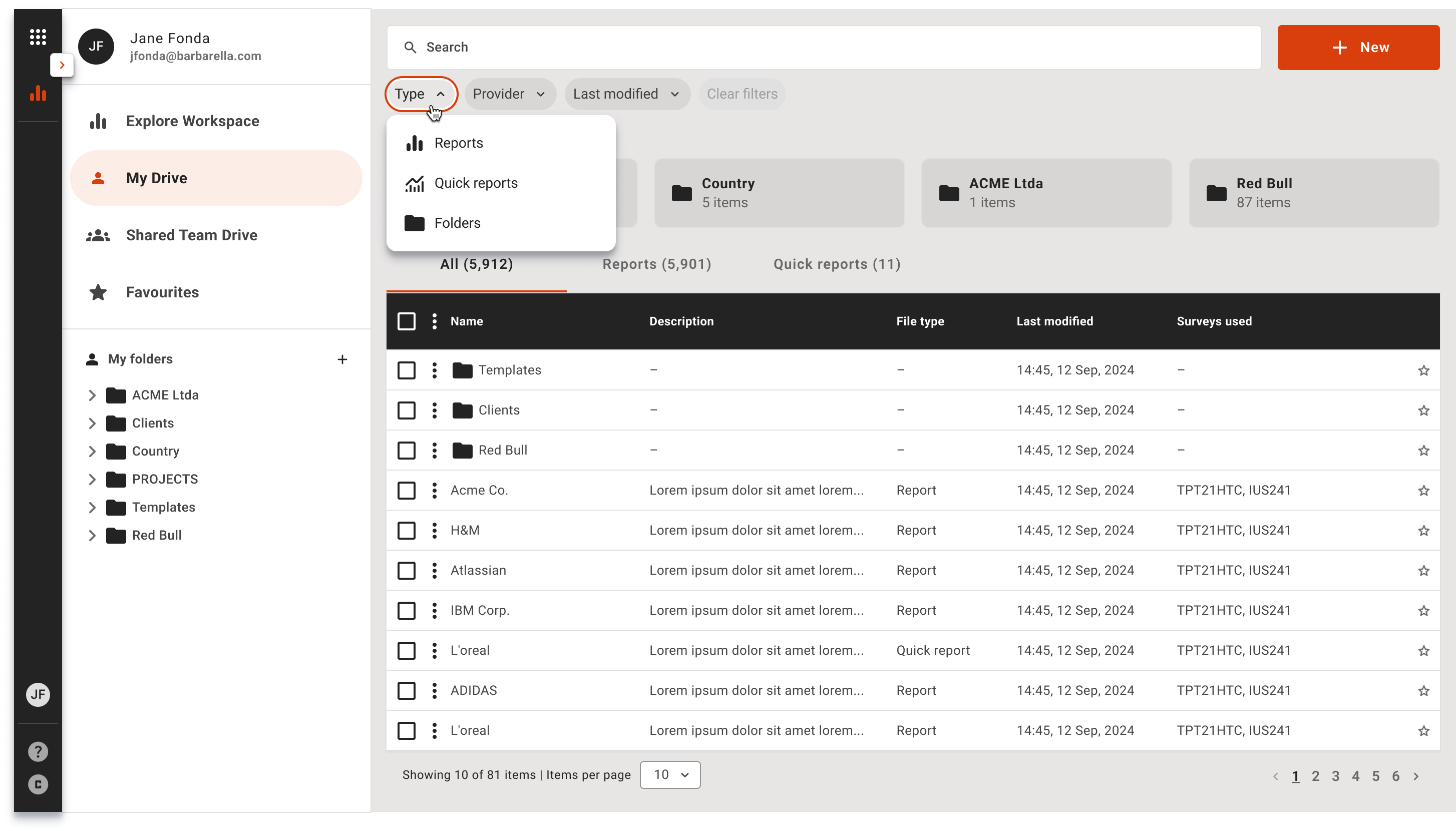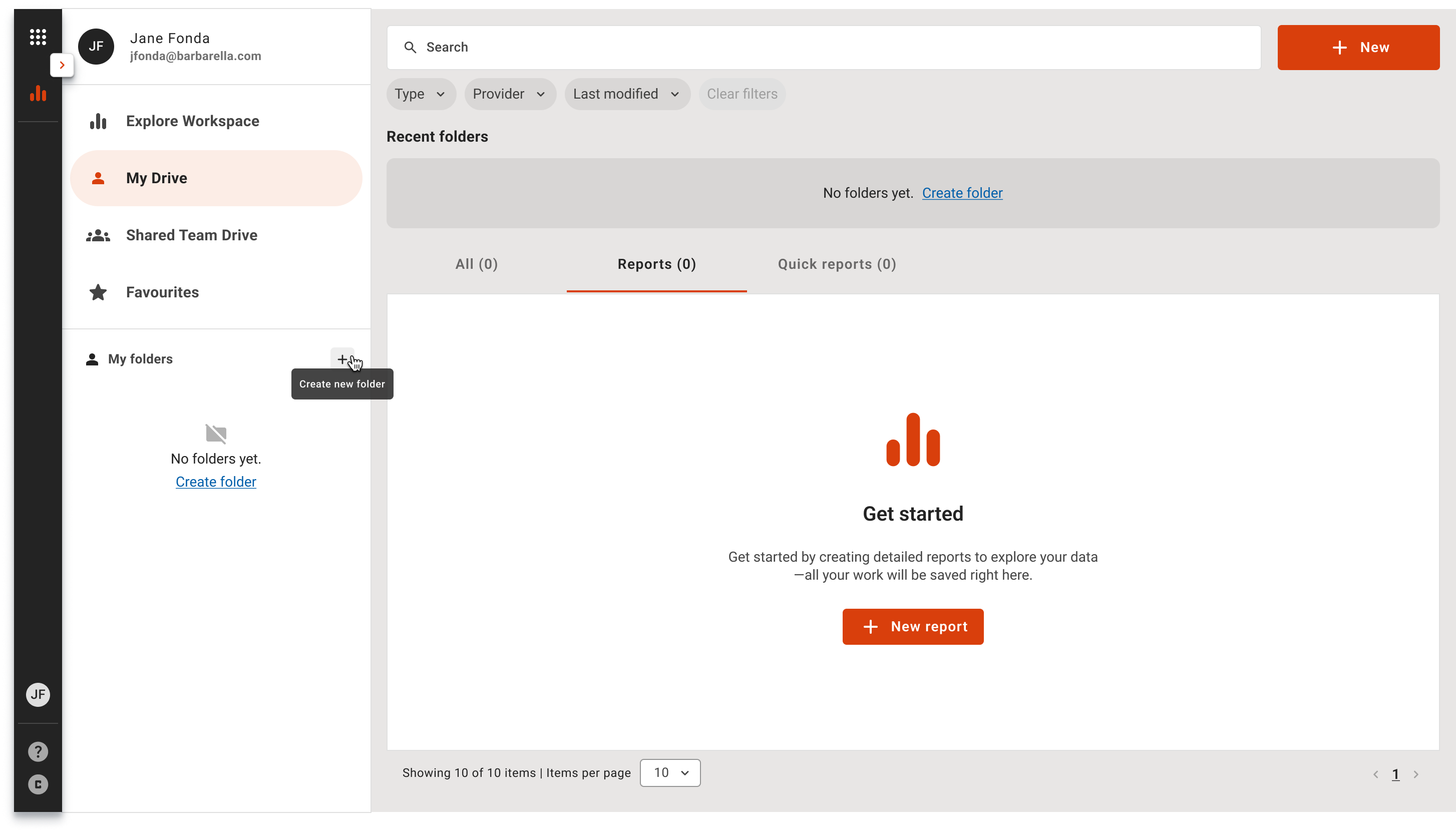 As a new user, your drive will initially be an empty workspace with no documents stored. Once you begin creating reports, campaigns, templates, and plans, they will be saved in this new workspace. On the landing workspace view, you'll see your most recent and favorite projects, allowing for quick and easy access to jump straight into your latest or most important work. Additionally, this view lets you manage and switch between your personal and company drives.