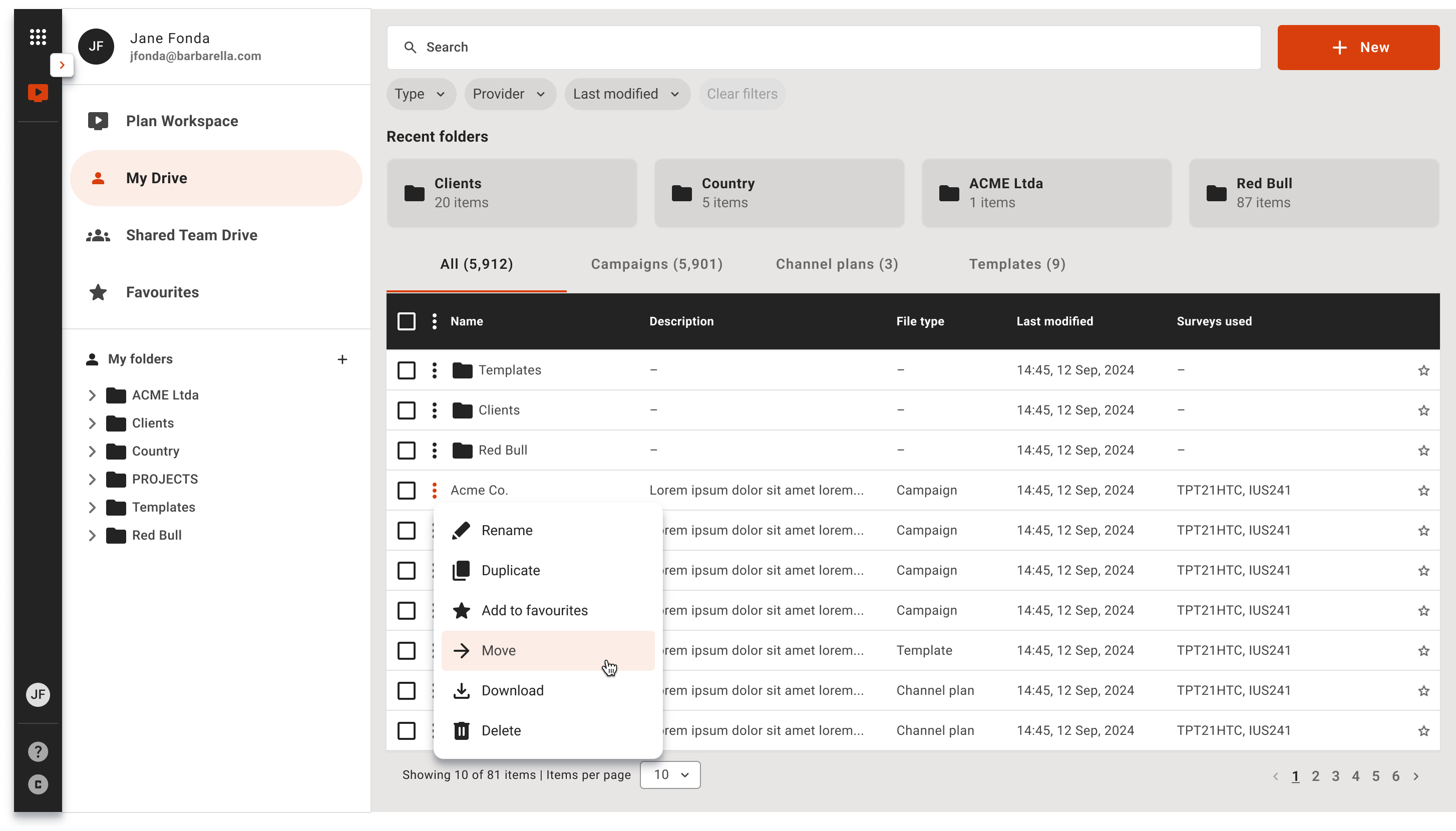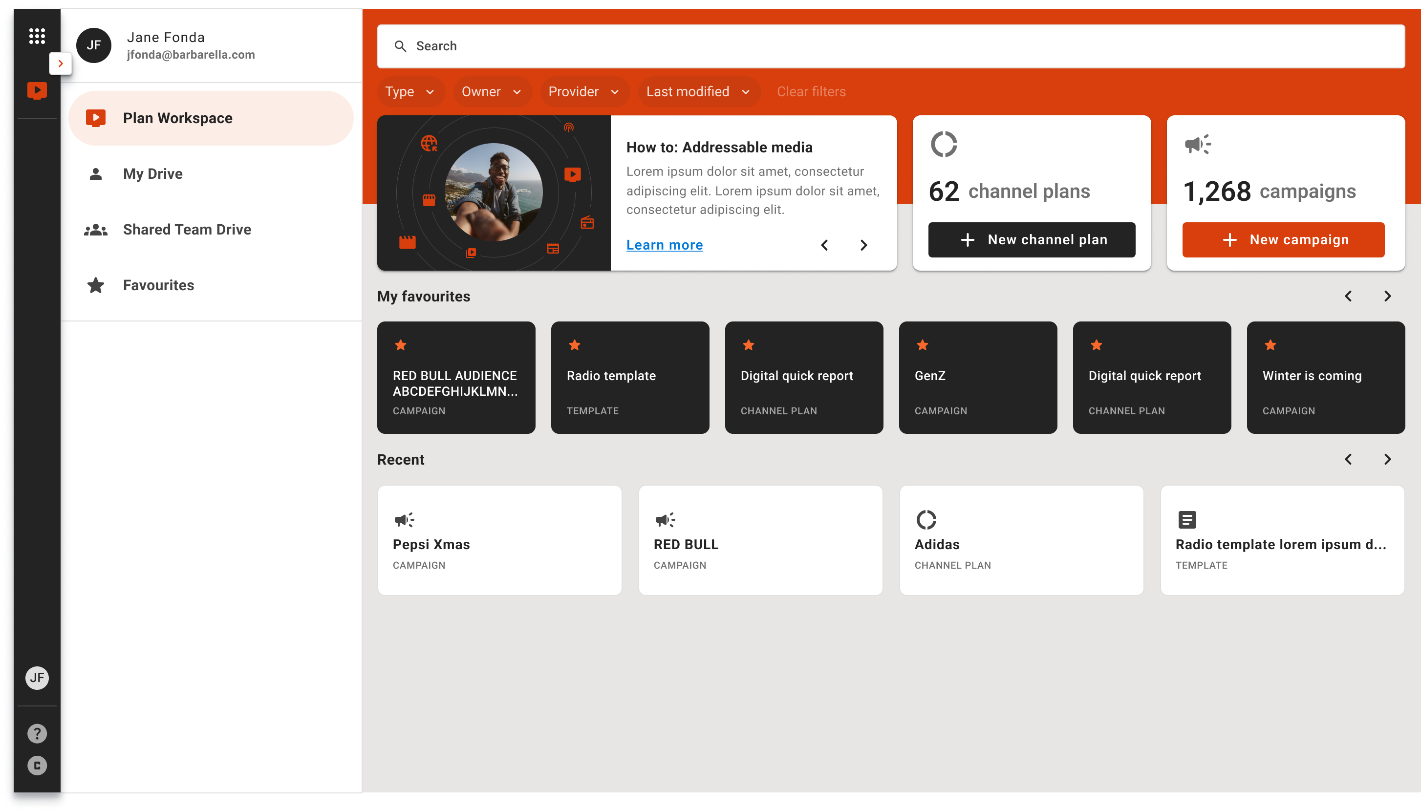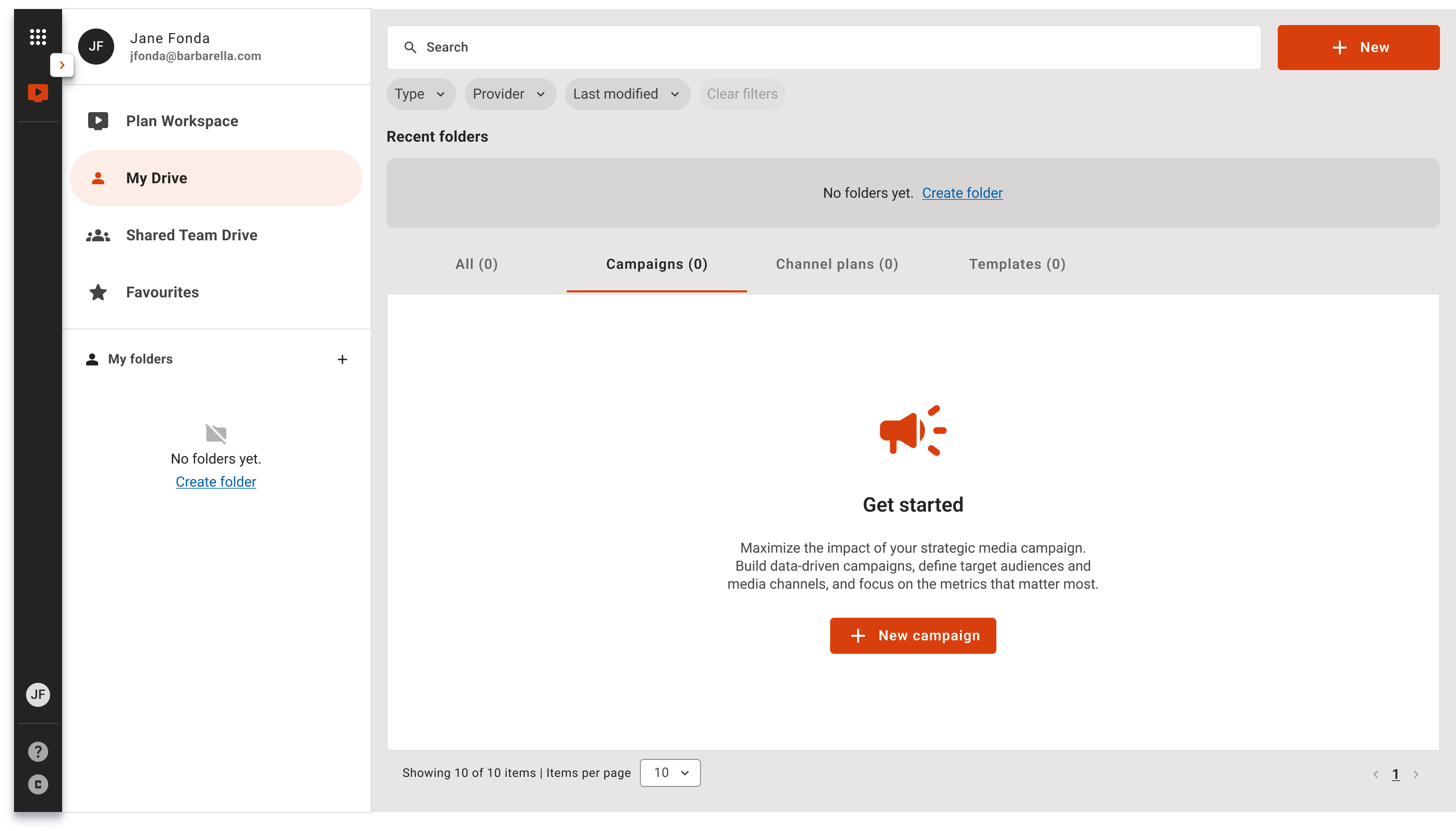 As a new user, your drive will initially be an empty workspace with no documents stored. Once you begin creating reports, campaigns, templates, and plans, they will be saved in this new workspace. On the landing workspace view, you'll see your most recent and favorite projects, allowing for quick and easy access to jump straight into your latest or most important work. Additionally, this view lets you manage and switch between your personal and company drives.